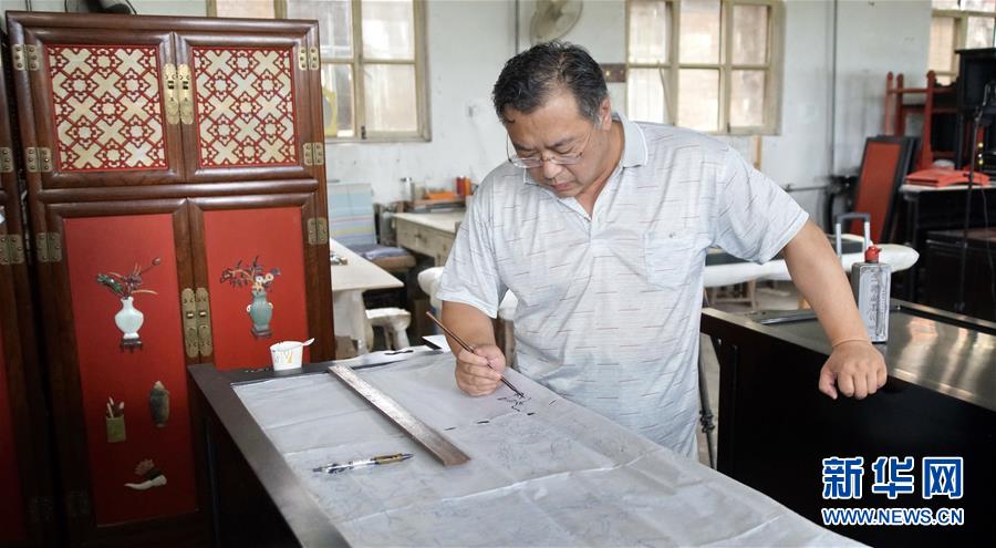 北京金漆鑲嵌有限責(zé)任公司工藝美術(shù)大師胡昕在創(chuàng)作漆畫(huà)屏風(fēng)(9月19日攝)。新華社記者李欣攝