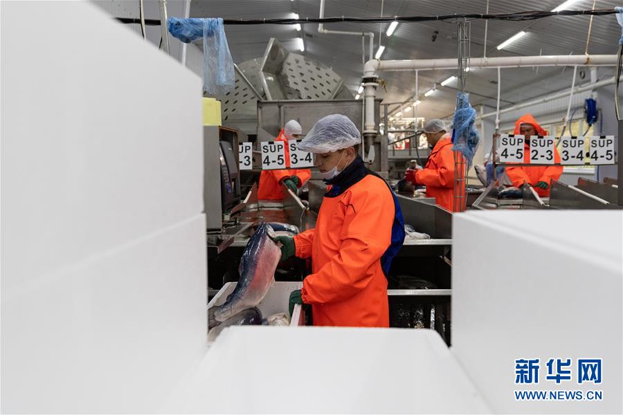 9月13日,在俄羅斯摩爾曼斯克,俄羅斯水產(chǎn)養(yǎng)殖公司工作人員在車間處理鮭魚。 新華社記者白雪騏攝