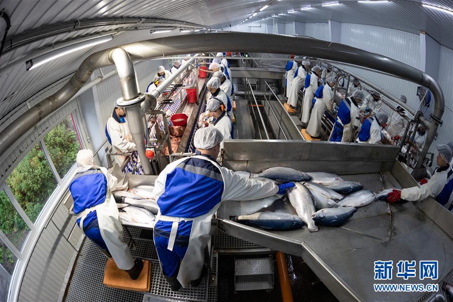 9月13日,在俄羅斯摩爾曼斯克,俄羅斯水產(chǎn)養(yǎng)殖公司工作人員在車間處理鮭魚。 新華社記者白雪騏攝