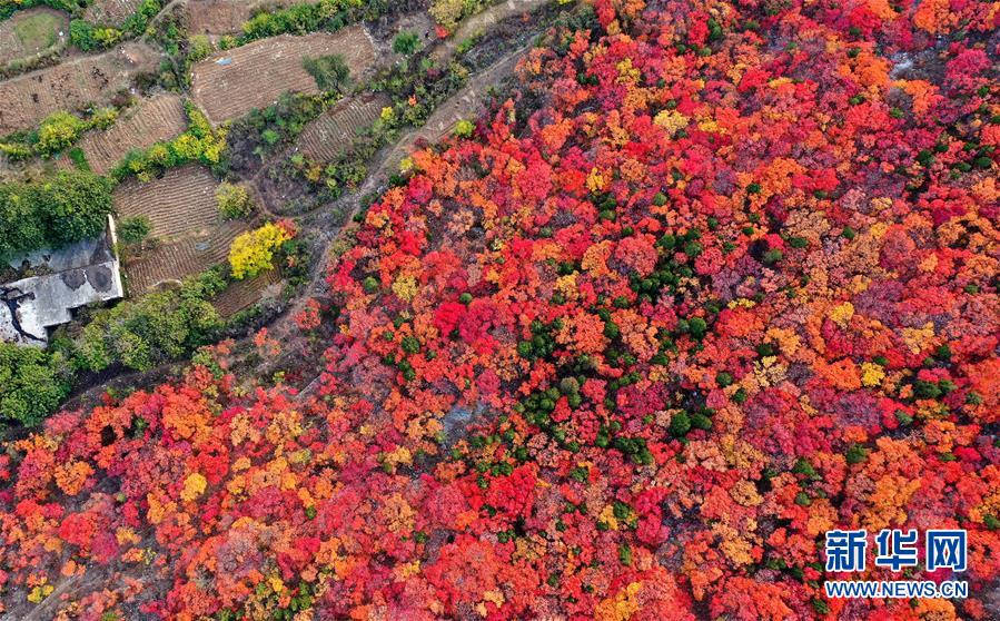 濟(jì)南蝎子山上火紅的黃櫨樹林(11月4日無(wú)人機(jī)拍攝)。 新華社記者 朱崢 攝