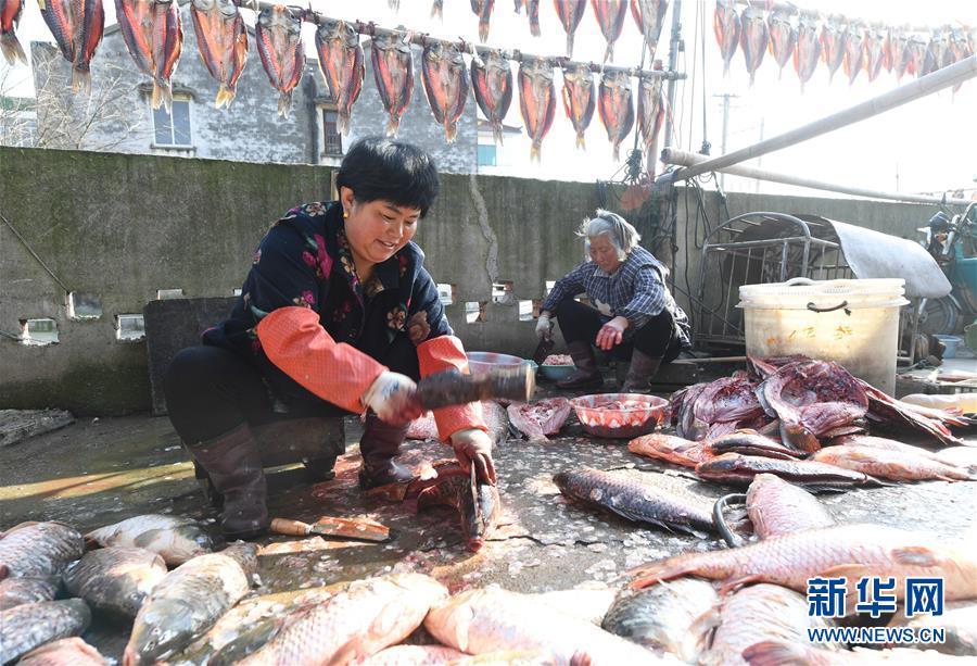 3月12日,浙江省湖州市吳興高新區(qū)幻溇村村民在剖魚準(zhǔn)備腌制魚干。近日,太湖南岸湖州地區(qū)久雨初晴,漁民忙著制作、晾曬魚干。新華社記者翁忻旸攝