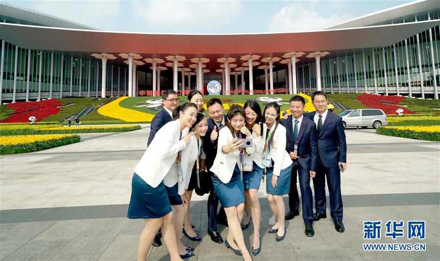 11月4日,第二屆中國國際進(jìn)口博覽會(huì)中國館的工作人員在國家會(huì)展中心(上海)南廣場合影。新華社記者陳建力攝