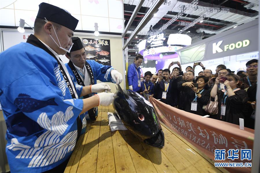 11月7日,來自日本長崎魚市株式會社的專業(yè)切魚師傅為解體70公斤藍鰭金槍魚做準備。第二屆中國國際進口博覽會正在上海國家會展中心舉行。博覽會的食品及農產品展區(qū)里匯集了來自世界各地的美食,同時也上演各種精彩美食秀。11月7日,來自日本長崎魚市株式會社的專業(yè)切魚師傅現(xiàn)場解體一條70公斤的藍鰭金槍魚,吸引大量參觀者觀看、品嘗。新華社記者王鵬攝