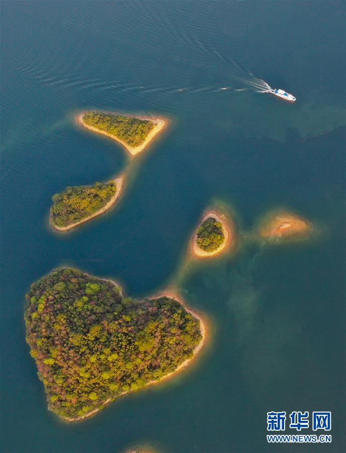 11月9日無(wú)人機(jī)拍攝的廬山西海。 當(dāng)日,落日余暉下的江西廬山西海山青水藍(lán),美不勝收。 新華社記者 周密 攝