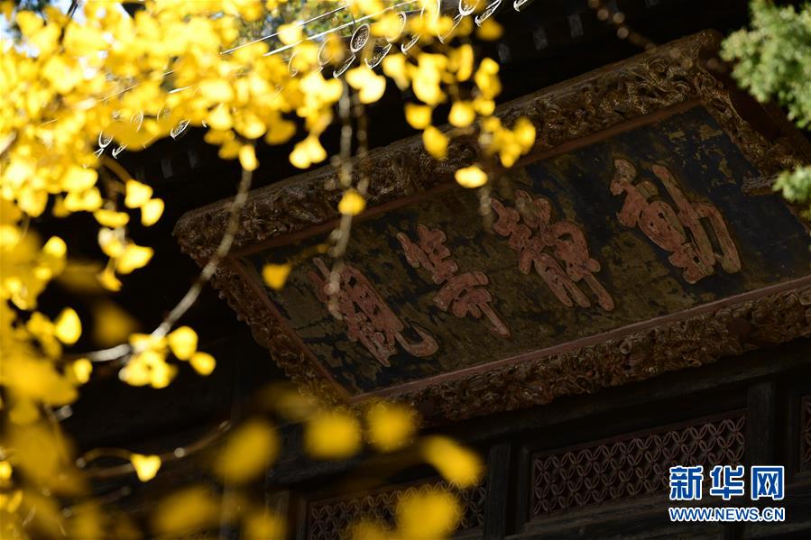11月11日,大覺寺內(nèi)的古銀杏黃葉與大殿牌匾相映成趣。新華社記者尹棟遜攝