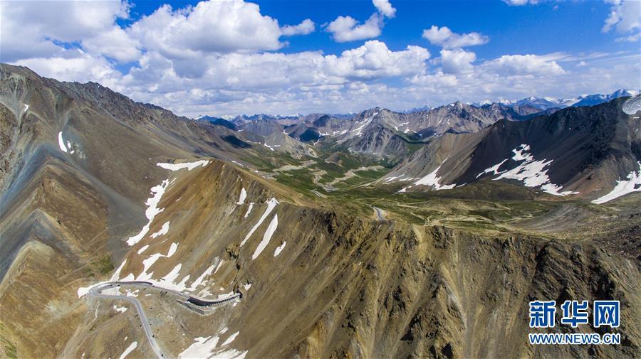 獨(dú)庫公路穿越海拔3390米的哈希勒根達(dá)坂(2017年7月13日無人機(jī)拍攝)。新華社記者江文耀攝