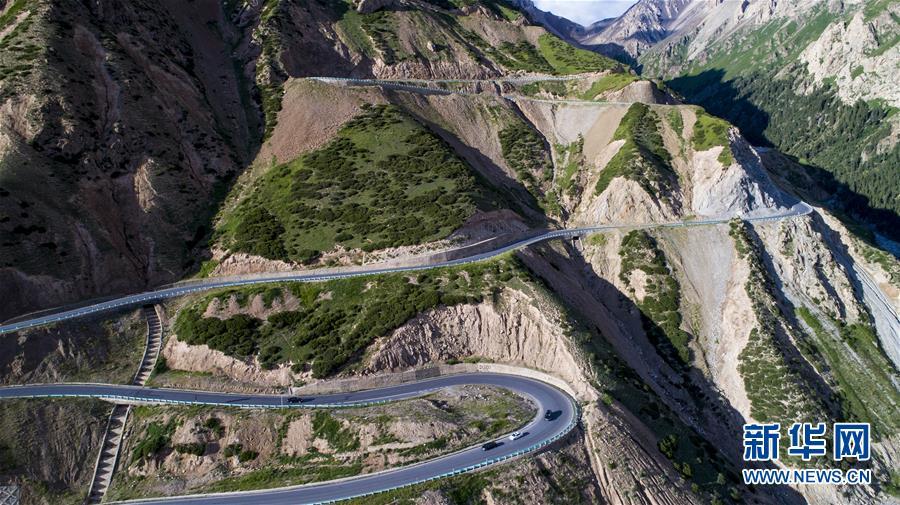 連續(xù)轉(zhuǎn)彎的獨(dú)庫公路盤山道(2017年7月15日無人機(jī)拍攝)。新華社記者江文耀攝