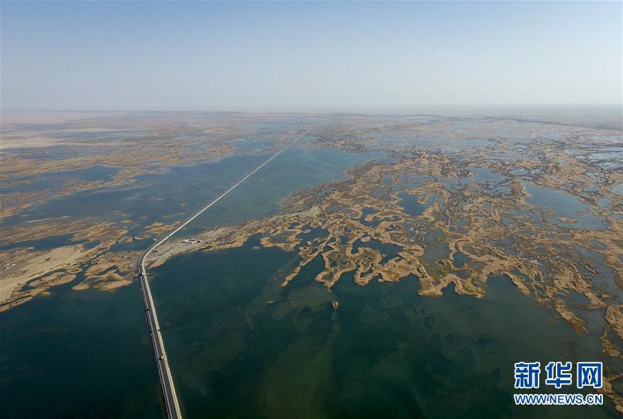 218國道在塔里木河尾閭——臺(tái)特瑪湖中間延伸(2017年10月22日無人機(jī)拍攝)。新華社記者趙戈攝