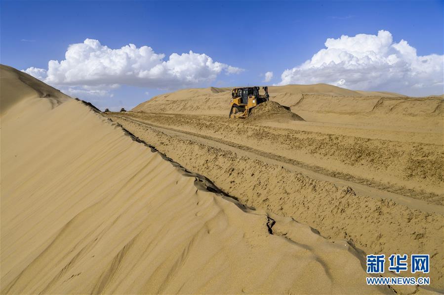 這是建設(shè)中的新疆且末縣至尉犁縣的沙漠公路(7月5日攝)。新華社記者胡虎虎攝