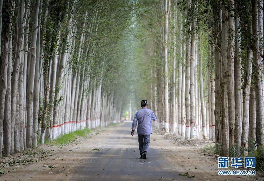 在新疆和田市伊力其鄉(xiāng)依蓋爾其村,如則托合提·如孜走在鄉(xiāng)間小路上(6月6日攝)。新華社記者趙戈攝