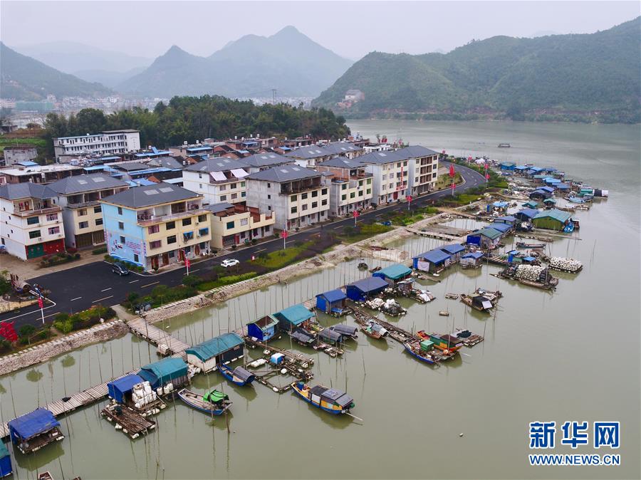 在寧德福安市溪邳村,一艘漁船經(jīng)過(guò)岸上新居(3月8日無(wú)人機(jī)拍攝)。新華社記者姜克紅攝