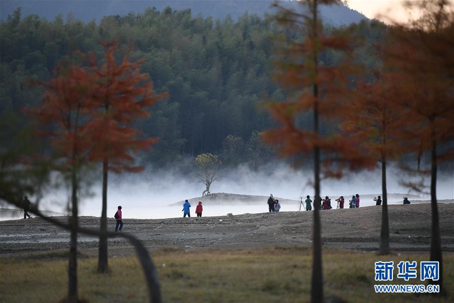 11月14日,游客在奇墅湖邊拍攝風(fēng)光。 初冬時(shí)節(jié),安徽省黃山市黟縣奇墅湖晨霧縹緲,別具韻味。新華社記者劉軍喜攝