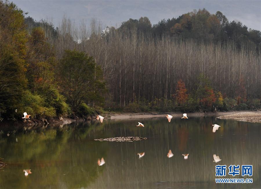 11月19日,朱鹮飛翔在陜西省漢中市西鄉(xiāng)縣峽口鎮(zhèn)牧馬河畔。 新華社記者陶明攝