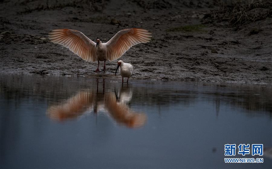 11月19日,朱鹮在漢江支流的牧馬河畔覓食。  新華社記者陶明攝