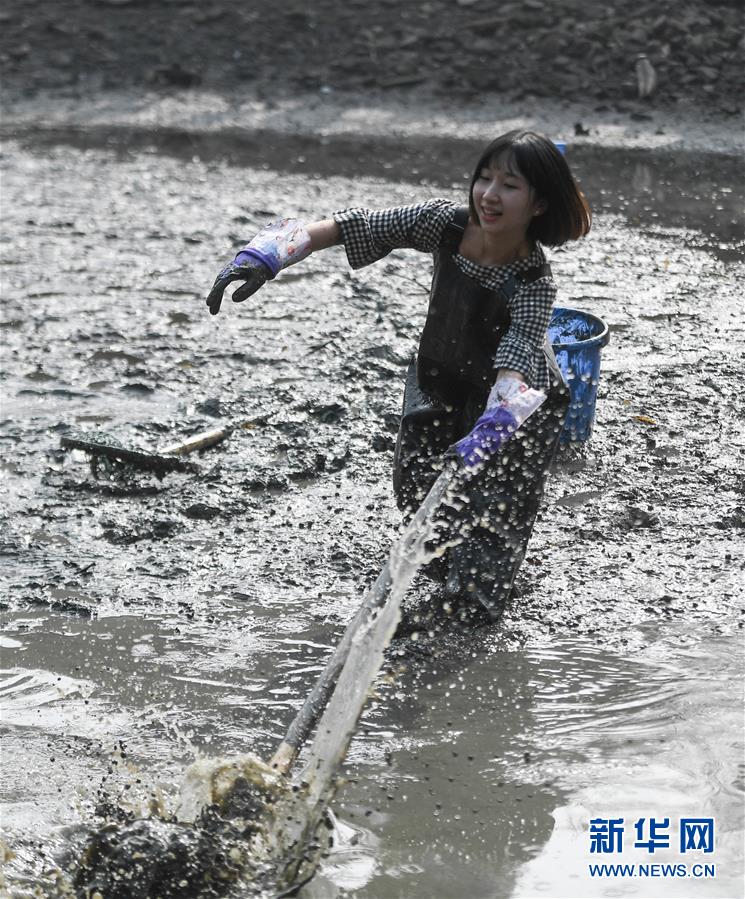杭州:游客體驗(yàn)“干塘”捕魚(yú)
