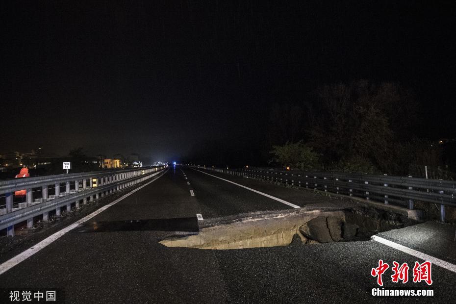 當(dāng)?shù)貢r(shí)間2019年11月24日,意大利Villafranca dAsti,意大利遭受惡劣天氣和持續(xù)多日的暴雨,通往都靈方向的A21高速公路路面出現(xiàn)“大坑”。圖片來(lái)源:視覺中國(guó)