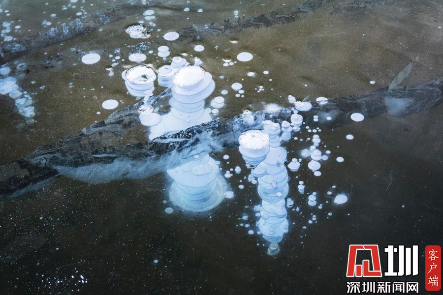 2019年11月26日,黑龍江漠河觀音山景區(qū)出現(xiàn)“冰泡”奇觀。透過晶瑩剔透的冰面,可以看到一串串潔白氣泡分布在冰層中。