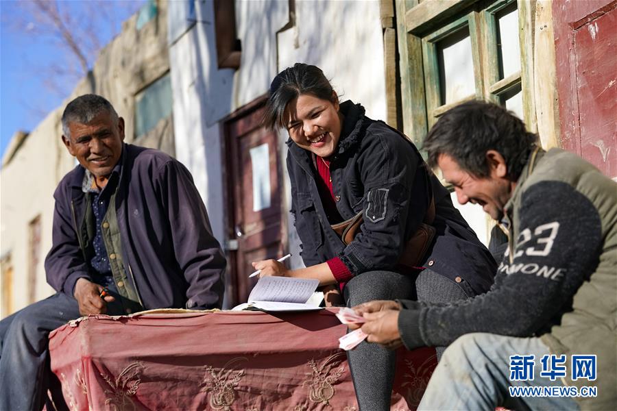 在地處塔克拉瑪干沙漠腹地的新疆于田縣達(dá)里雅布依鄉(xiāng),庫爾班罕·買提肉孜(中)與養(yǎng)羊合作社的合作伙伴結(jié)算購買羊肉的費用(11月13日攝)。