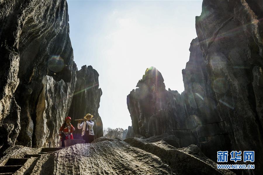 當?shù)厣贁?shù)民族樂手在石林景區(qū)演奏民族音樂(11月27日攝)。新華社記者蘭紅光攝