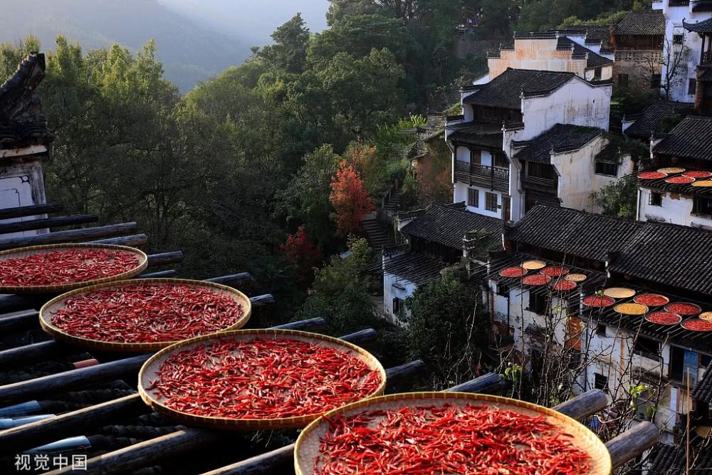 2018年8月7日,江西婺源縣篁嶺古村落,壯觀“曬秋”場(chǎng)景。當(dāng)日立秋節(jié)氣,江西婺源縣篁嶺古村的農(nóng)作物普遍豐收,村民們又迎來了一年一度的“曬秋”季。村民們將收獲來的紅辣椒、玉米、南瓜、稻谷和菊花等色彩斑斕的農(nóng)作物,晾曬在依山而建的徽派民居房前屋后的木制曬架上,在秋日陽光的照射下,色彩繽紛圓圓的曬扁,鋪就在錯(cuò)落有致的徽派民居之間,格外璀璨奪目,蔚為壯觀。目前,“篁嶺曬秋”已經(jīng)成為中國鄉(xiāng)村旅游的一張名片。