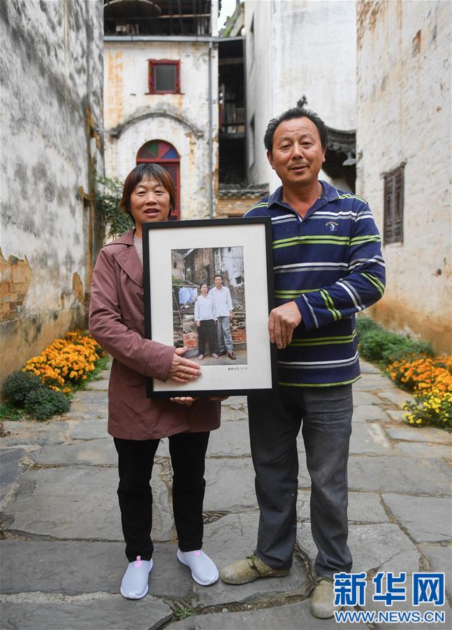 篁嶺村村民曹根旺夫婦拿著2010年自己的老照片在家門前留影(11月7日攝)。新華社記者胡晨歡攝