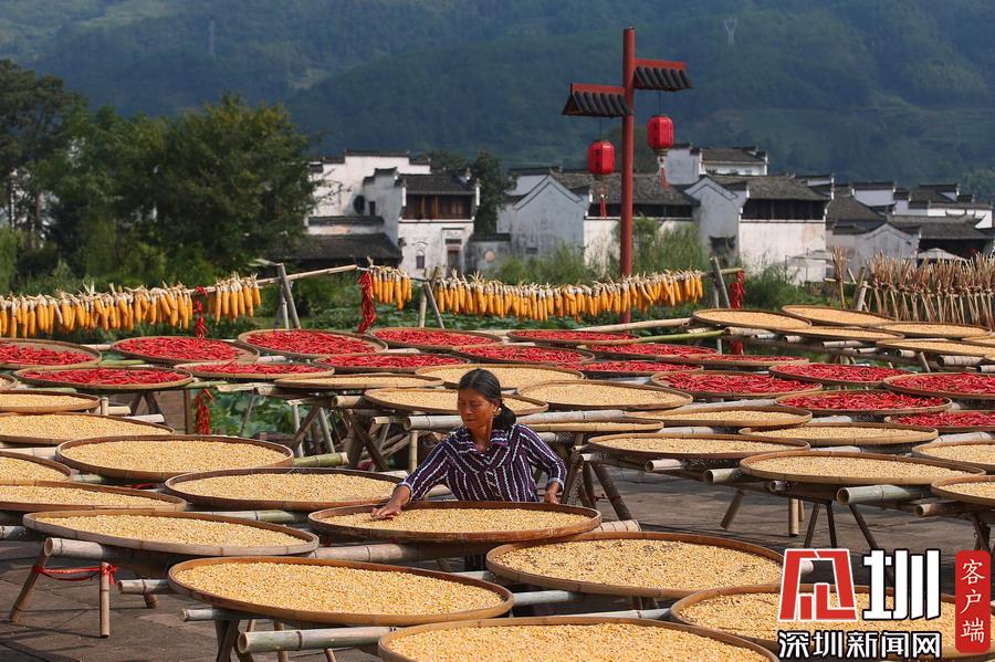 2019年9月9日,安徽黃山,呈坎古村村民在曬場(chǎng)上晾曬農(nóng)作物。
