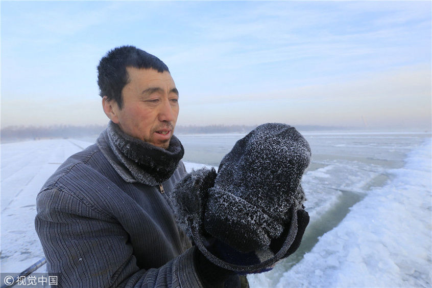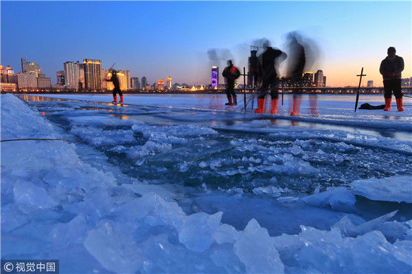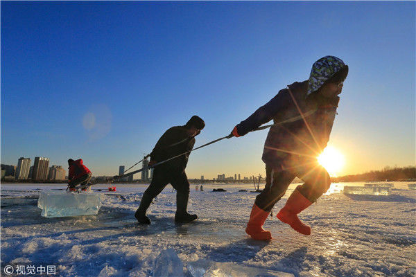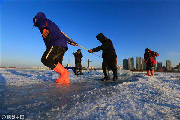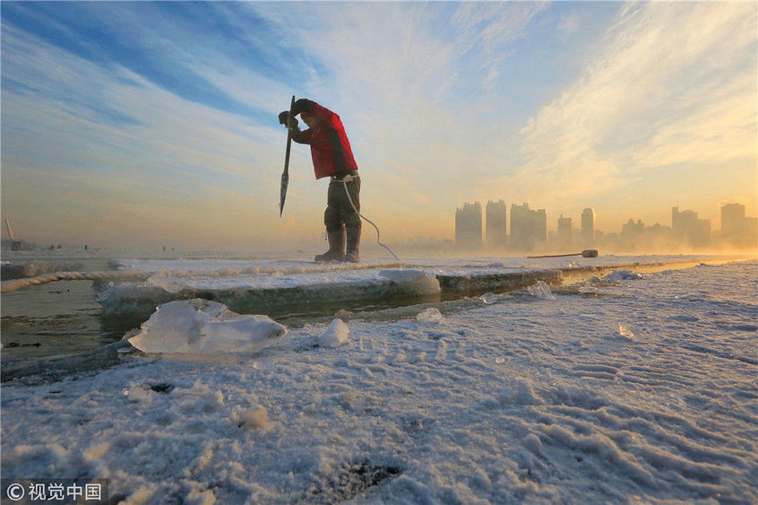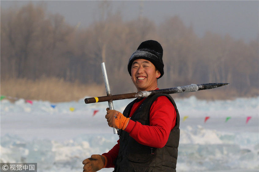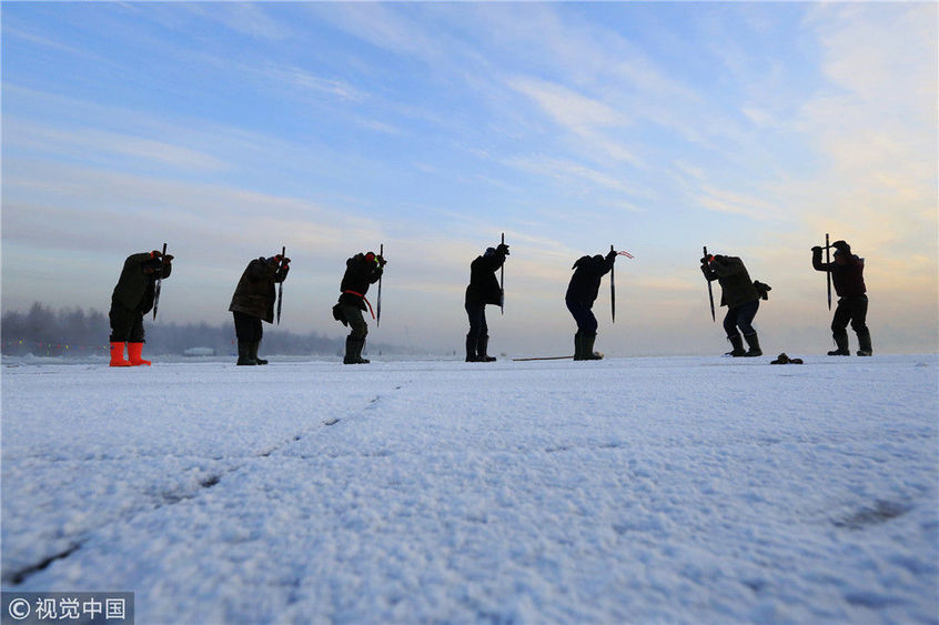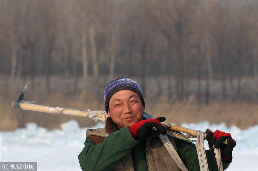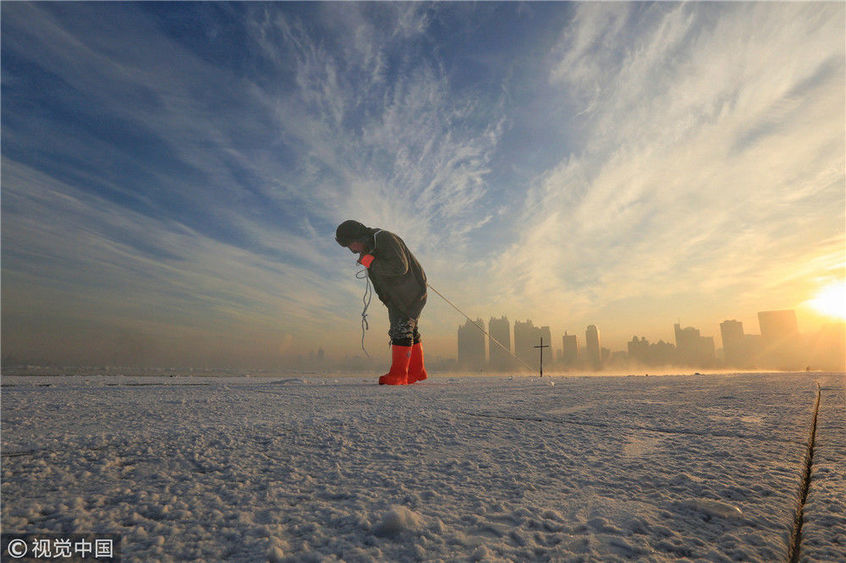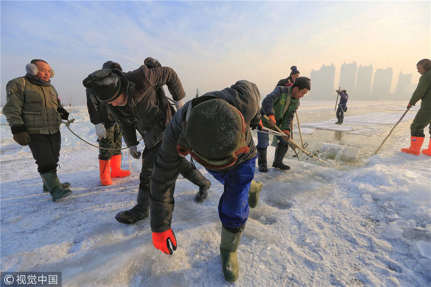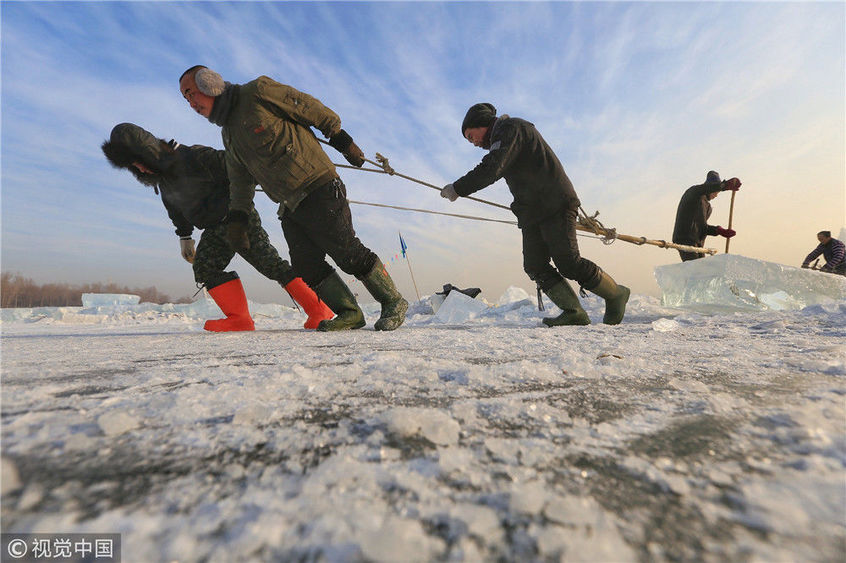 2018年12月11日,黑龍江省哈爾濱市,松花江上,采冰者們彎腰拉繩,宛如纖夫般拽重達(dá)半噸的冰塊出水。采冰者都是自哈市江北萬寶、東發(fā)、沙陀子等鄉(xiāng)鎮(zhèn)的農(nóng)民,他們每年冬閑時(shí)都會(huì)親屬、村鄰之間結(jié)伴到松花江畔采冰,有的采冰人,已經(jīng)連續(xù)干了二十多年。每個(gè)采冰季,他們每天要在冰面上工作10-12個(gè)小時(shí),每個(gè)采冰組,一天要拽出冰塊2000-3000塊,一個(gè)近20天的采冰季,每人能收入近萬元。視覺中國(guó)