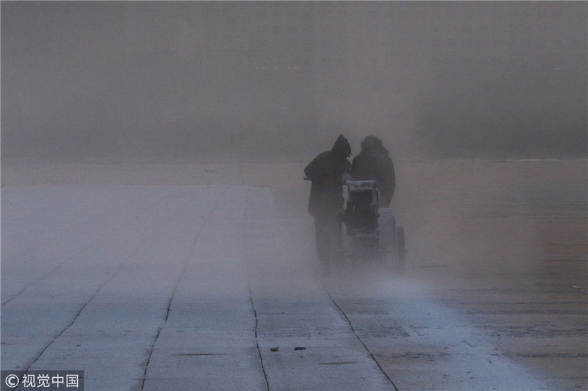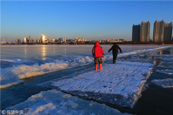 2018年12月11日,黑龍江省哈爾濱市,松花江上,采冰者們彎腰拉繩,宛如纖夫般拽重達(dá)半噸的冰塊出水。采冰者都是自哈市江北萬寶、東發(fā)、沙陀子等鄉(xiāng)鎮(zhèn)的農(nóng)民,他們每年冬閑時(shí)都會(huì)親屬、村鄰之間結(jié)伴到松花江畔采冰,有的采冰人,已經(jīng)連續(xù)干了二十多年。每個(gè)采冰季,他們每天要在冰面上工作10-12個(gè)小時(shí),每個(gè)采冰組,一天要拽出冰塊2000-3000塊,一個(gè)近20天的采冰季,每人能收入近萬元。