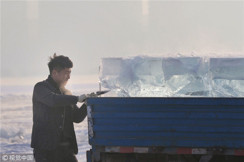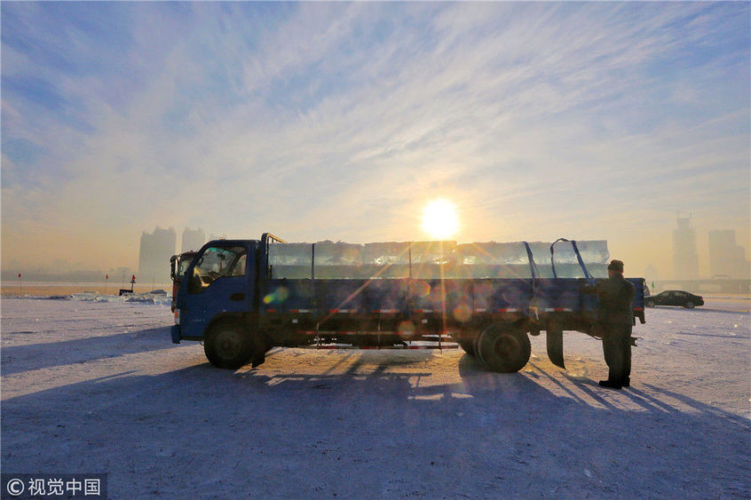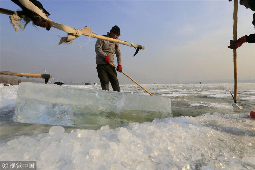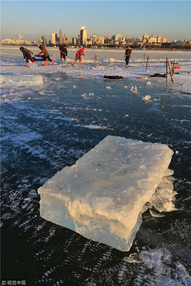 2018年12月8日,最低氣溫零下22度,哈爾濱市江北公路大橋東側(cè)的江面上,工人們正在從江中撈取冰塊,裝車運(yùn)往景區(qū)制作冰燈、冰雕。現(xiàn)場(chǎng),工人先是用電鋸、鐵釬將冰分割成半米多寬,一米多長(zhǎng)的冰塊,接著將其拉出水面。等候在旁的叉車上前,將冰裝上運(yùn)冰的卡車,之后裝滿冰塊的卡車駛往景區(qū)。