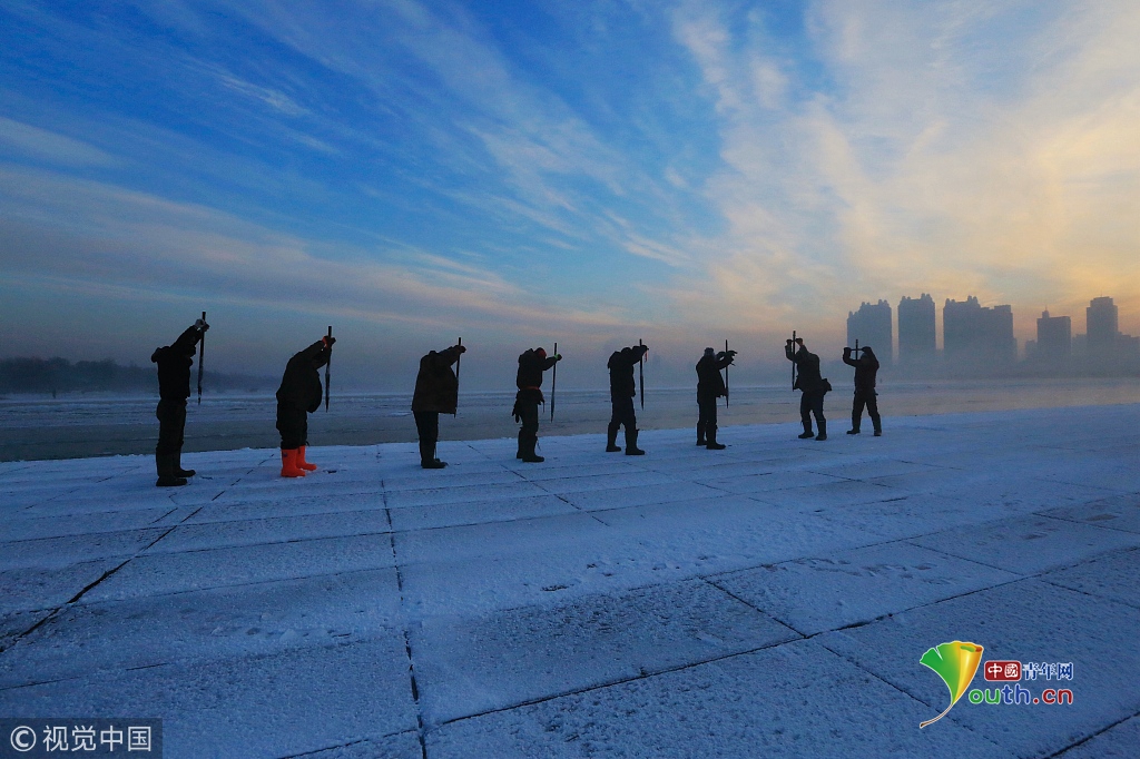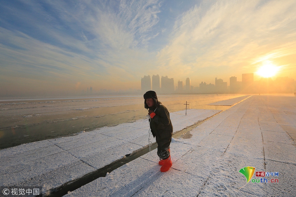 中國(guó)青年網(wǎng)2018年12月13日訊2018年12月11日,黑龍江省哈爾濱市,松花江上,采冰人在漫天霞光中破冰、采冰,金色光芒在水霧上升騰繚繞,給勞動(dòng)的場(chǎng)面增添了詩(shī)意。