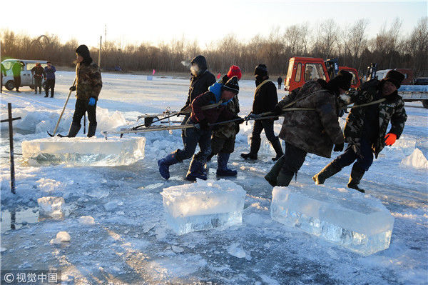 2018年12月8日,最低氣溫零下22度,哈爾濱市江北公路大橋東側(cè)的江面上,工人們正在從江中撈取冰塊,裝車運往景區(qū)制作冰燈、冰雕?,F(xiàn)場,工人先是用電鋸、鐵釬將冰分割成半米多寬,一米多長的冰塊,接著將其拉出水面。等候在旁的叉車上前,將冰裝上運冰的卡車,之后裝滿冰塊的卡車駛往景區(qū)。
