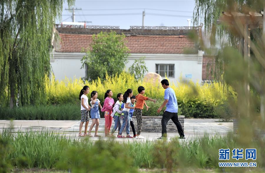 寧夏永寧縣原隆村的孩子們在新居前的休閑廣場上玩耍(2018年8月攝)。新華社記者劉軍喜攝