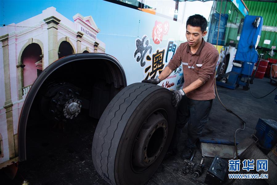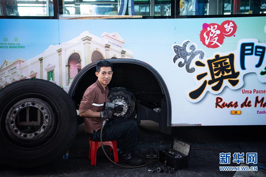 11月26日,澳門公共汽車股份有限公司鄭家松在工作,他已經(jīng)工作了2年,主要負(fù)責(zé)為公交車做定期保養(yǎng)及維修。 新華社記者 張金加 攝