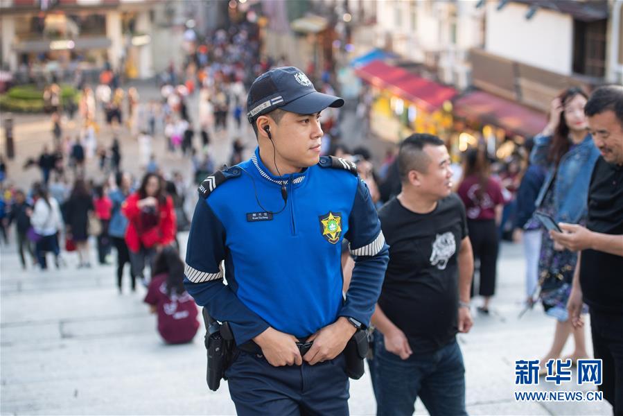 11月28日,澳門治安警察局旅游警察關(guān)天恒在大三巴牌坊附近巡邏,他已經(jīng)工作了2年,主要負(fù)責(zé)維持社會(huì)治安及解答游客問(wèn)題。 新華社記者 張金加 攝