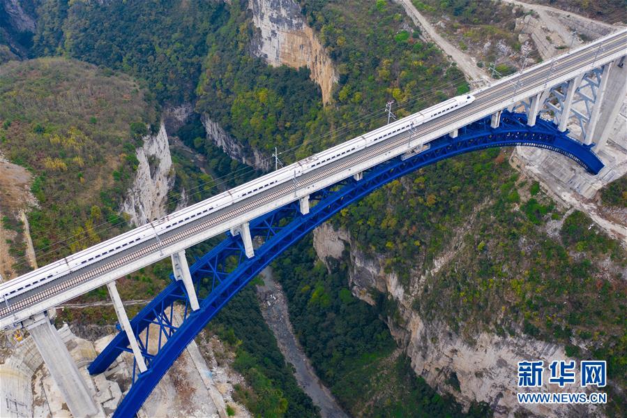 12月2日,一輛試驗(yàn)列車(chē)駛過(guò)成貴高鐵西溪河大橋(無(wú)人機(jī)拍攝)。新華社記者劉續(xù)攝