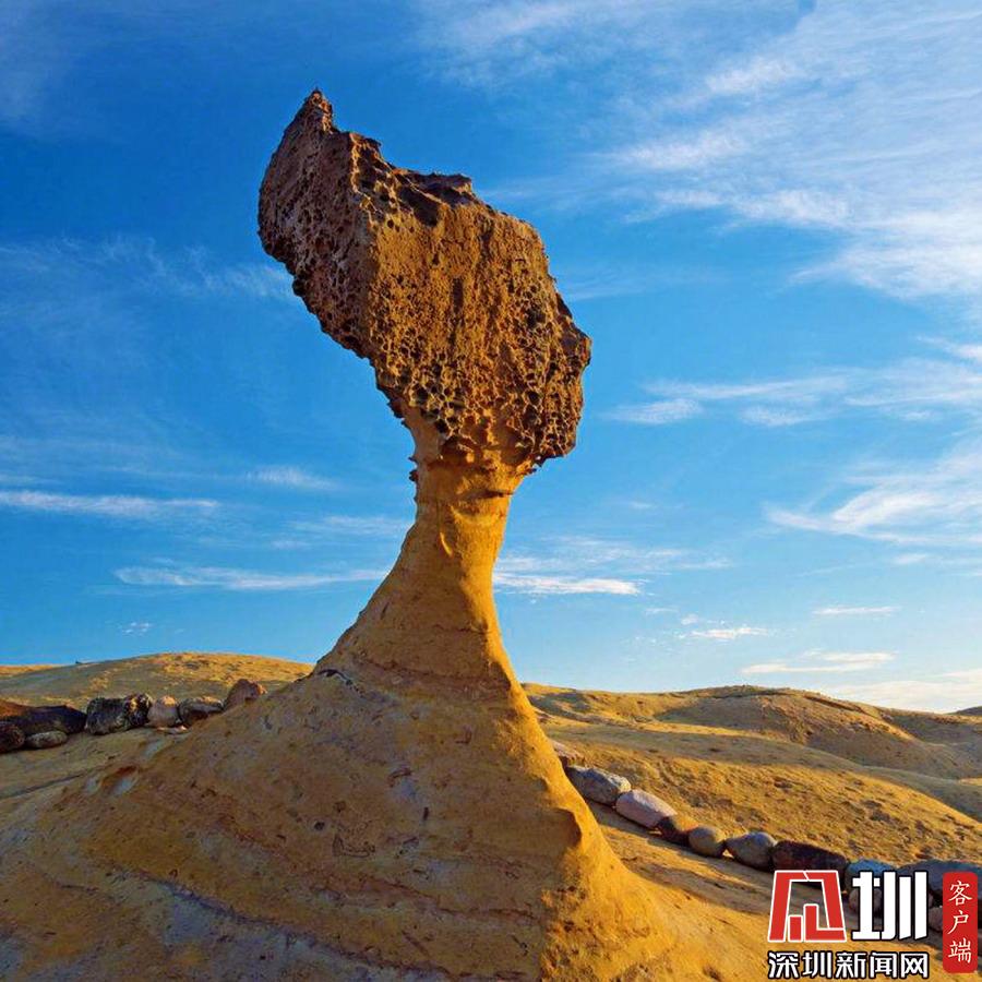 野柳地質(zhì)公園(Yehliu Geopark),位于臺(tái)灣新北市萬里區(qū),野柳是突出海面的岬角(大屯山系),長約1700公尺,由于海蝕風(fēng)化及地殼運(yùn)動(dòng)等作用,造就了海蝕洞溝、蜂窩石、燭狀石、豆腐石、蕈狀巖、壺穴、溶蝕盤等綿延羅列的奇特景觀。孫遜攝