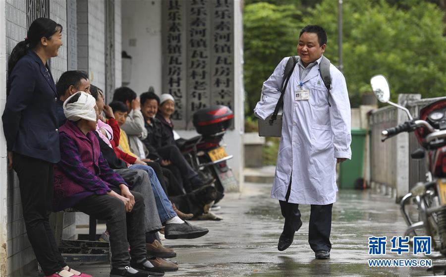 5月28日,何永清(右)一大早出門“送醫(yī)上門”后回到村衛(wèi)生室時,門口排滿了等待就診的村民。何永清是陜西省略陽縣樂素河鎮(zhèn)瓦房村衛(wèi)生室的一名村醫(yī),幼年時因車禍?zhǔn)ビ冶邸?006年7月從漢中市衛(wèi)校畢業(yè)后,他選擇回到山大溝深的秦嶺腹地故鄉(xiāng)工作。十多年來,何永清堅守在基層衛(wèi)生第一線,鄉(xiāng)親們親切地稱他為“我們的獨臂村醫(yī)”。新華社記者陶明攝