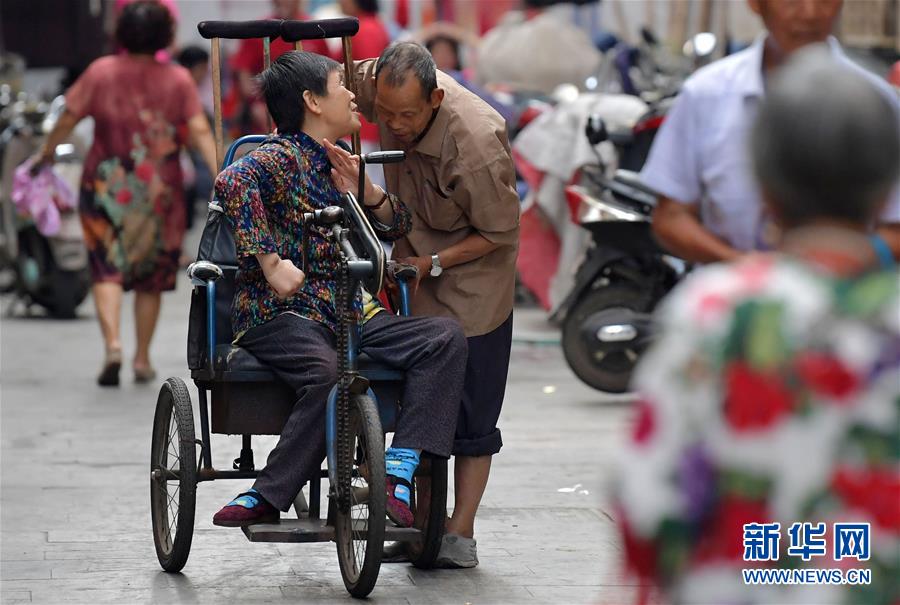葉文娟在熊金根耳邊交代要買的東西(10月2日攝)。江西省南昌市西湖區(qū)繩金塔社區(qū)有一對特殊的夫妻,74歲的丈夫熊金根聽力殘疾,67歲的妻子葉文娟患小兒麻痹癥后行動不便。夫妻二人相互照顧相濡以沫度過了30余年。新華社記者彭昭之?dāng)z