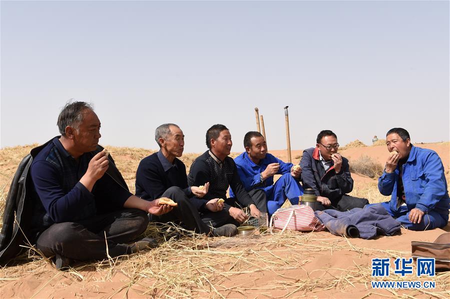 在甘肅省古浪縣境內(nèi)的黑崗沙風(fēng)沙口,八步沙第二代治沙人賀中強(左一)、郭萬剛(左二)、石銀山(左三)、羅興全(右三)、程生學(xué)(右二)、王志鵬(右一)在休息間隙吃午飯(3月26日攝)。二十世紀(jì)八十年代,八步沙是騰格里沙漠南緣甘肅省古浪縣最大的風(fēng)沙口。當(dāng)?shù)亓荒挲g加在一起近300歲的老漢,在承包沙漠的合同書上按下手印,誓用白發(fā)換綠洲。38年過去,六老漢只剩兩位在世。