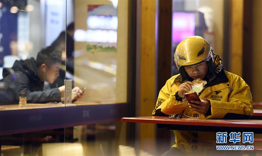 1月27日晚,送餐的間隙,來自湖南岳陽的“外賣小哥”丁鴻在一家餐廳外一邊啃面包一邊看手機。臨近春節(jié),萬家團圓,而城市里的外賣配送員仍然騎行在街頭巷尾,將美食和春節(jié)祝福一起準(zhǔn)時送達(dá)。新華社記者李尕攝