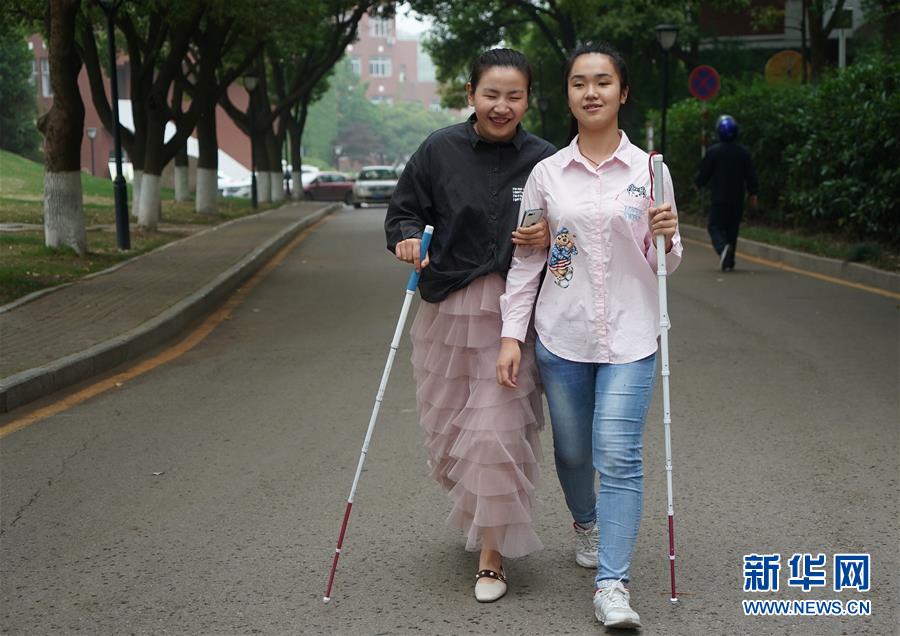 5月17日,在南京特殊教育師范學(xué)院,周文晴(右)和鄔逸帆走在校園內(nèi)。1997年出生的鄔逸帆和1998年出生的周文晴都是從小失去視覺。她們學(xué)習(xí)努力,相互幫助,大學(xué)生活和同齡人一樣豐富多彩。新華社記者季春鵬攝