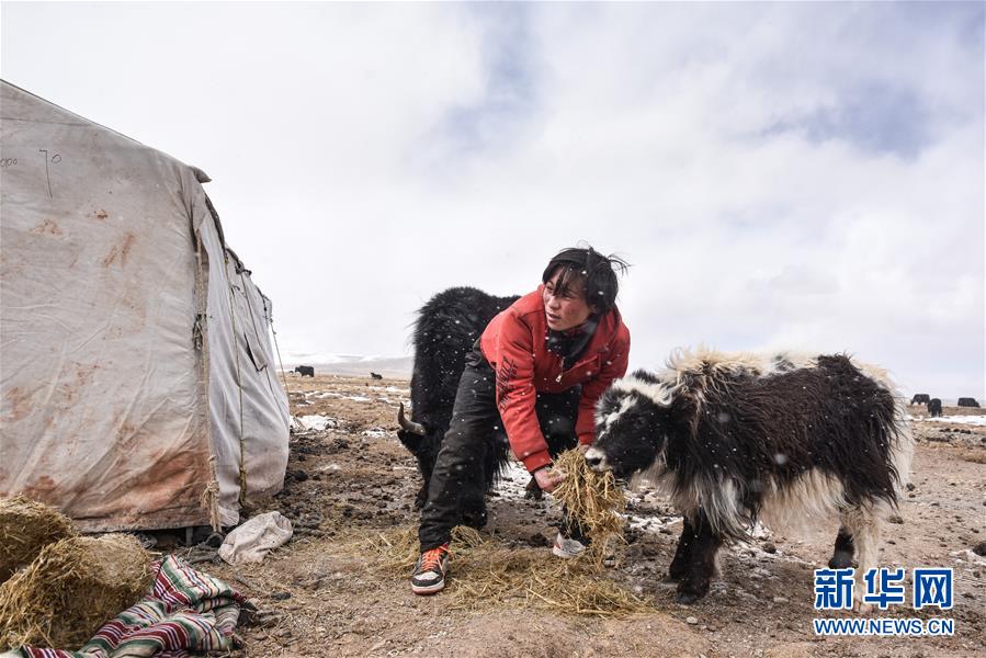 2月22日,才巴拉加在麥雄灘的帳篷前給牛犢喂飼料。今年年初,青海省玉樹藏族自治州遭遇重度雪災(zāi),部分地區(qū)積雪深度超過半米,牲畜覓食困難,餓死凍死超2萬頭只。麥雄灘位于巴顏喀拉山腳下的玉樹藏族自治州稱多縣清水河鎮(zhèn)文措村,是此次玉樹雪災(zāi)中化雪較快、接納受災(zāi)轉(zhuǎn)場外地牧民最多的地點(diǎn)之一。文措村黨支部書記白尕召集村民開會(huì),大家一致同意拿出30萬畝草場,供受災(zāi)更嚴(yán)重的其他地區(qū)牧民使用。新華社記者吳剛攝
