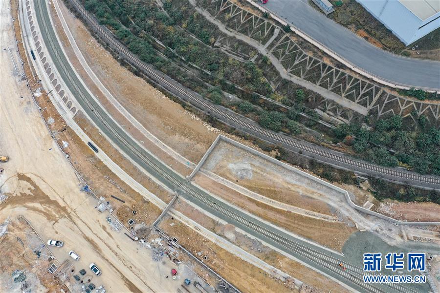 12月17日,中鐵八局建設者們在改貌鐵路口岸施工(無人機拍攝)。 新華社記者 劉續(xù) 攝