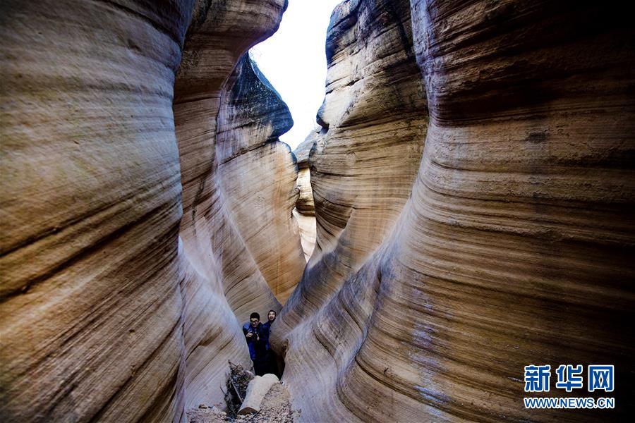 12月17日,游人在志丹縣雙河鎮(zhèn)毛項峽谷內(nèi)游覽。毛項峽谷位于陜西省延安市志丹縣雙河鎮(zhèn)毛項村,峽谷全長12公里,分為9段,曲折綿延,谷內(nèi)石壁凹凸不平,其中最窄處只能容一人側(cè)身通過,堪稱黃土高原上的自然奇觀。新華社記者陶明攝