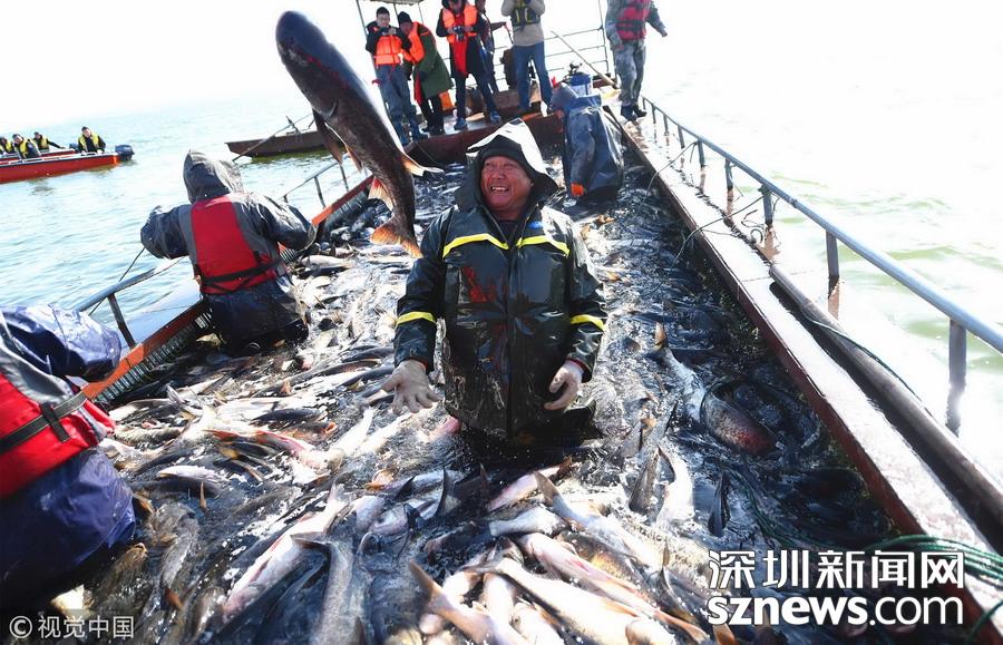 2018年12月26日,吉林松原,查干湖迎來了“紅網”,單網捕撈約30萬斤。