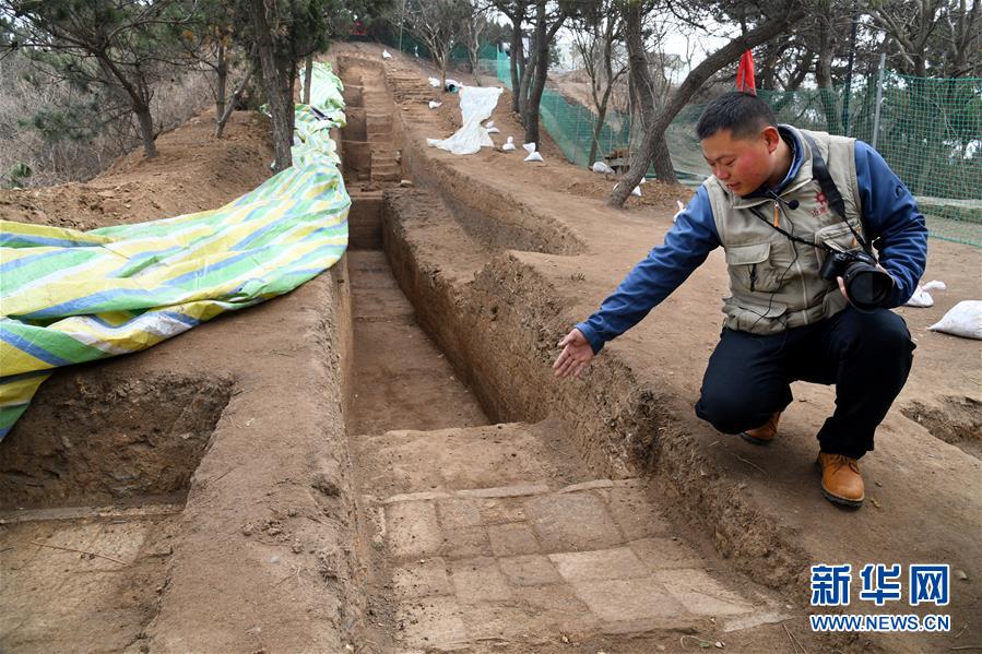 考古隊(duì)員在瑯琊臺遺址考古發(fā)掘現(xiàn)場介紹發(fā)掘出的秦漢時期的石砌道路(12月21日攝)。新華社記者李紫恒攝