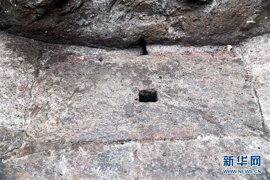 在瑯琊臺遺址考古發(fā)掘現(xiàn)場拍攝的秦漢時期的石砌地漏,六方大小石塊斜面壘砌,中間的石塊開有方形小孔。根據(jù)地漏的形狀和制作的精細(xì)程度,可以初步判斷它應(yīng)該用于室內(nèi)排水(12月21日攝)。新華社記者李紫恒攝
