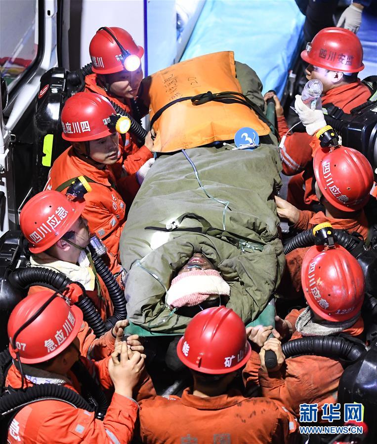 12月18日,救援人員轉(zhuǎn)運安全升井的被困人員。 當(dāng)日7時56分,經(jīng)過80多個小時的緊張救援,發(fā)生透水事故的川煤集團杉木樹煤礦13名被困人員全部安全升井。 新華社記者 薛玉斌 攝