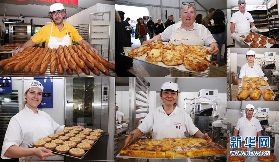 2019年5月11日,在法國巴黎圣母院附近舉行的第24屆面包節(jié)上,面包師展示新鮮出爐的面包和甜品(拼版照片)。 新華社記者 高靜 攝