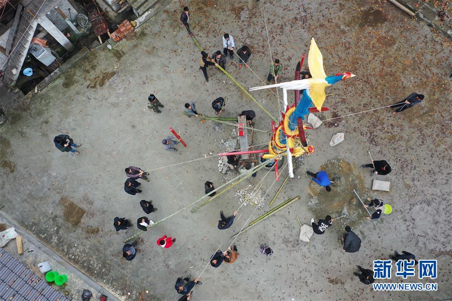 烏英苗寨的村民在立新蘆笙柱(12月22日無人機(jī)拍攝)。